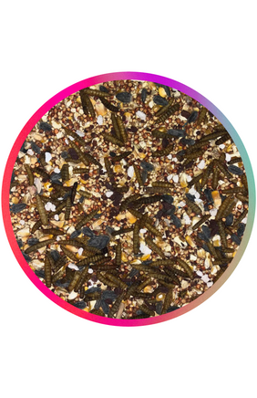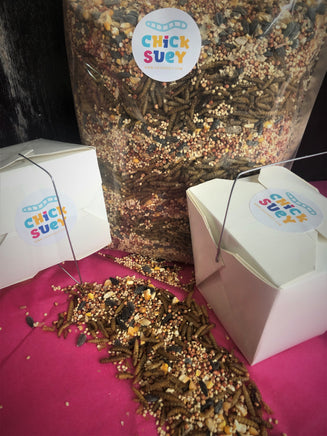 EGG DROPPER SUEY has a hearty amount of grubs and a variety of seeds with the addition of oysters shells and poultry grit. This new mix contains black soldier fly larvae, millet, sunflower seeds, corn scratch, and small amounts of oyster shells and poultry grit! Black soldier fly larvae are high in protein and calcium. Feeding your fowl high protein treats not only makes them happy but their egg shells will be stronger and yolks golder. Seeds also contain proteins and oils beneficial to your animals, promotes scratching to help with healthy nails. To properly digest food poultry swallow tiny stones (or poultry grit we add to this mix). Your chickens, ducks, turkeys, peacocks and other fowl will come running when you say Chick ChickSuey! Baa-cauck! Note on all our products: Not for human consumption, may contain seeds, nuts, and soy.
